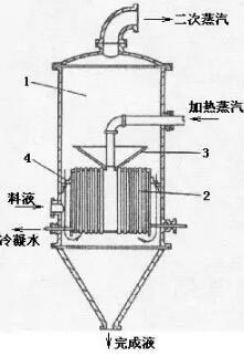 由于在循環管與加熱管中液體的密度不同。所以物料循環產生液體,在蒸發器內,溶液是由加熱管往上走。受熱以后達到沸騰。溶液沸騰后產生的二次蒸氣經分離器與除沫器由頂部排出。液體則經中央循環管下降。降至蒸發器底的液體又沿加熱管上升。如此不斷循環。溶液的循環速度也不斷加快。可達0.1~0.5 m/s。因而可以提高蒸發器的傳熱系數與生產強度。此種蒸發器適用于黏度大的溶液和易結垢或結晶的溶液。