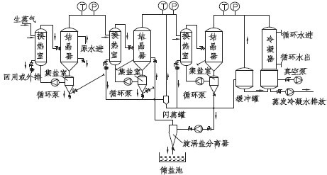 需要蒸發(fā)的物料經(jīng)進(jìn)料泵進(jìn)入一效加熱器進(jìn)行加熱,然后進(jìn)入蒸發(fā)室,進(jìn)行蒸發(fā),在分離器中進(jìn)行氣液分離,溶液從分離器底部流入循環(huán)泵吸入口,利用循環(huán)泵送入加熱器、分離器進(jìn)行循環(huán)流動(dòng)與蒸發(fā),蒸發(fā)出來的蒸汽進(jìn)入冷凝器被全部冷凝。在蒸發(fā)換熱室內(nèi),外接蒸汽液化產(chǎn)生汽化潛熱,對(duì)廢水進(jìn)行加熱。由于蒸發(fā)換熱室內(nèi)壓力較大,物料在蒸發(fā)換熱室中高于正常液體沸點(diǎn)壓力下加熱至過熱。加熱后的液體進(jìn)入結(jié)晶蒸發(fā)室后,物料的壓力迅速下降,導(dǎo)致部分物料水溶液閃蒸或者沸騰。廢水蒸發(fā)后的蒸汽進(jìn)入二效蒸發(fā)器作為動(dòng)力蒸發(fā)器進(jìn)行加熱,未蒸發(fā)廢水和鹽分暫存在結(jié)晶蒸發(fā)室。一效、二效、三效蒸發(fā)器之間通過平衡管相通,在負(fù)壓所用下,高含鹽廢水或物料由一效向二效、三效依次流動(dòng),廢水不斷被蒸發(fā),廢水中鹽的濃度越來越高,當(dāng)廢水物料中的鹽分超過飽和狀態(tài)時(shí),水中鹽分就會(huì)不斷地析出,進(jìn)入蒸發(fā)結(jié)晶室的下部的集鹽室,整個(gè)過程周而復(fù)始,實(shí)現(xiàn)鹽水分離。
